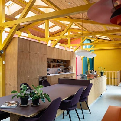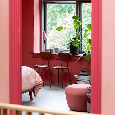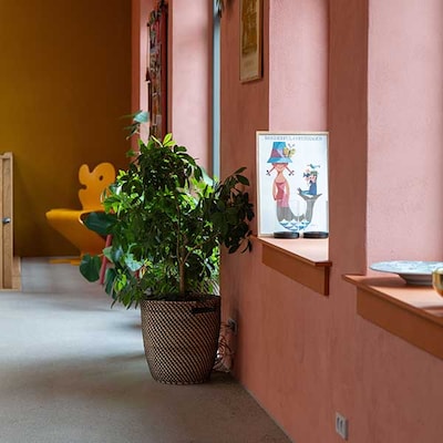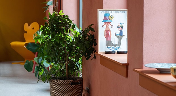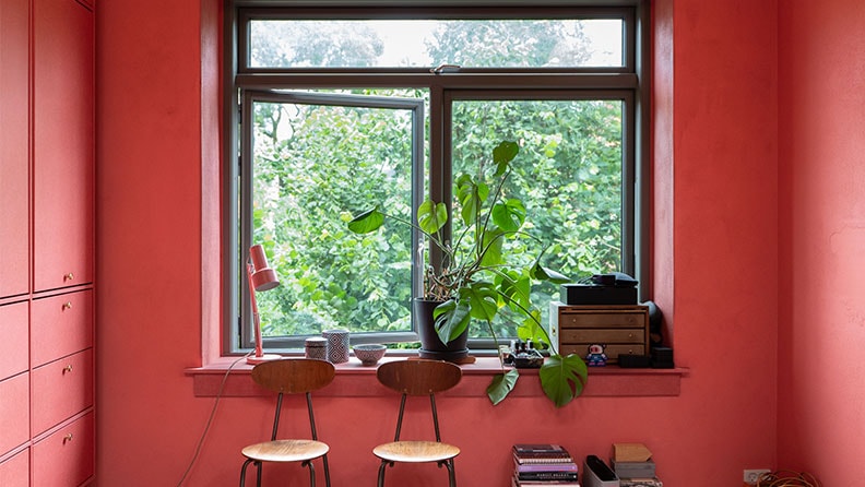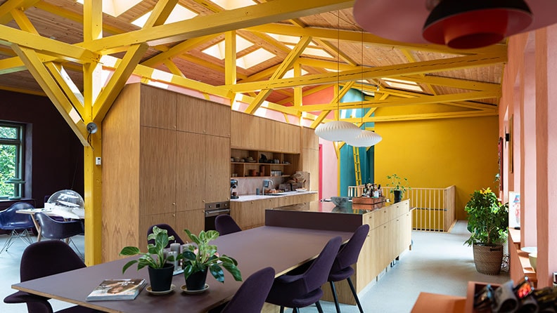Men det er ikke bare showroomet, der er badet i forskellige farver. Hele huset er gennemsyret af Karstens modstand mod det klassisk hvide. Men også mod konventionelle metoder. Den abrikosrosa væg i køkkenet er f.eks. tørrullet med Nordsjö Professional P6, og farven udgør grundlaget i hele indretningen. Da den var på plads, vidste Karsten præcist, hvordan resten af boligen skulle se ud.