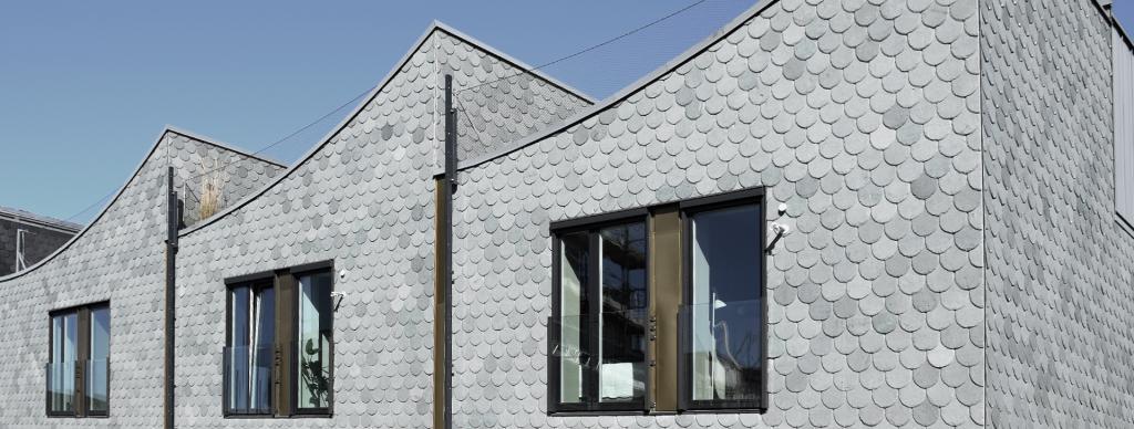 Udenfor giver Morgondoppets facader i fiskeskælslignende skifer et unikt look. Indenfor har husene en industriel og rå stemning. Men det er måske først og fremmest samspillet mellem det udvendige og det indvendige, der med de store glaspartier giver husene deres særlige karakter. Dette stiller også høje krav til finishen på alle malede overflader.